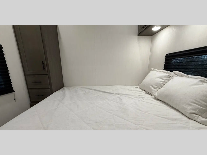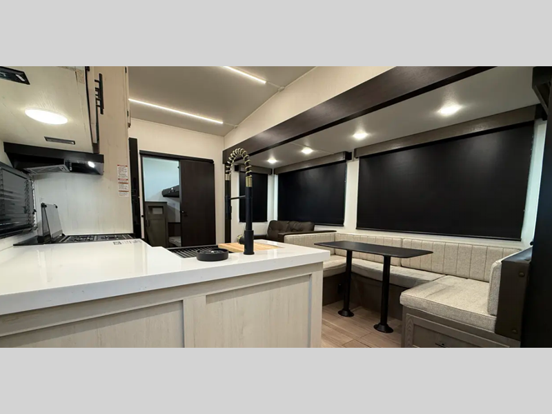 Some of the top features you'll find on these fifth wheels are an armored underbelly tank enclosure and forced air heat, an automatic leveling and stabilization system, and a Juice Pack solar system. Interior features continue on with solid surface countertops with underlighting, fully adjustable, slow rise, blackout roller shades in the main living area, and a pet friendly "Clean Sweep" floor design with no heat vents.