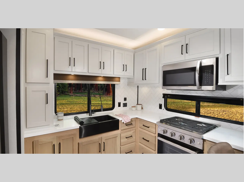 Sleeps 4 Slides 3 Length 36 ft 4 in Ext Width 8 ft Ext Height 13 ft 4 in Hitch Weight 1560 lbs GVWR 13560 lbs Dry Weight 10319 lbs Cargo Capacity 3241 lbs Fresh Water Capacity 50 gals Grey Water Capacity 50 gals Black Water Capacity 50 gals Tire Size 16" Furnace BTU 40000 btu Available Beds King Refrigerator Type 12V Stainless Cooktop Burners 3 Number of Awnings 1 LP Tank Capacity 30 lbs Water Heater Capacity 60000 gal Water Heater Type On Demand Tankless AC BTU 30000 btu TV Info LR 50" Flat Screen TV Awning Info 10' 8" and 16' Electric with LED Light Strip Axle Count 2 Washer/Dryer Available Yes Number of LP Tanks 2 Shower Type Walk-In Shower Similar Floorplans