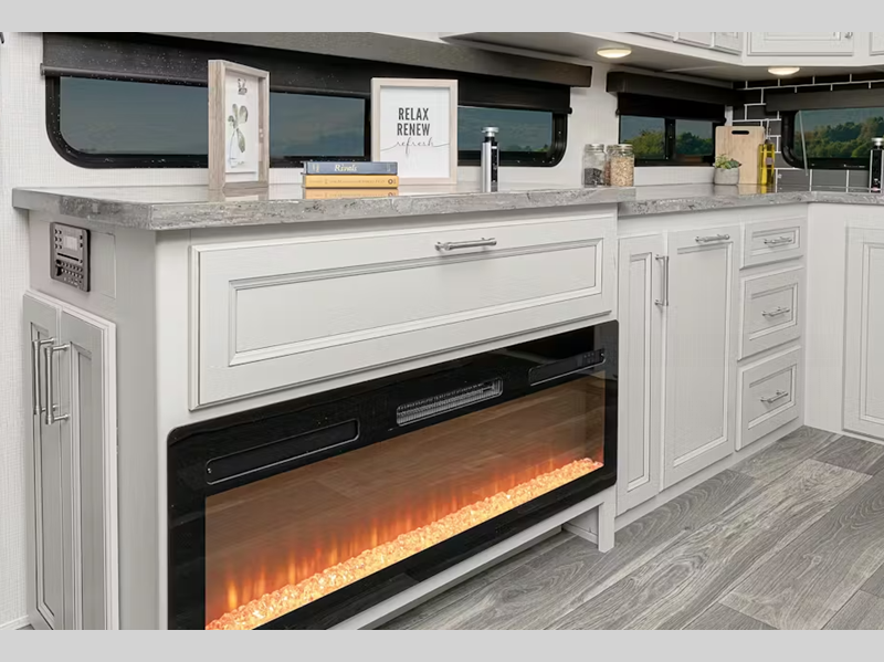 - Full pass through storage with LED light strip, power outlets and TV hookups