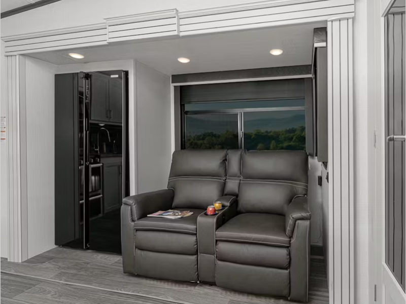 Sleeps 5 Slides 3 Length 39 ft 3 in Ext Height 13 ft 4 in Exterior Color Black Onyx Midnight, Phantom Gray Midnight, Hero Edition Options Hitch Weight 2000 lbs Dry Weight 11740 lbs Cargo Capacity 2160 lbs Fresh Water Capacity 75 gals Grey Water Capacity 76 gals Black Water Capacity 76 gals Tire Size ST235/80R16E Furnace BTU 30000 btu Available Beds Queen Refrigerator Type 12V Refrigerator Size 16 cu ft Cooktop Burners 3 Number of Awnings 2 LP Tank Capacity 30 lbs Water Heater Type Tankless On Demand AC BTU 15000 btu TV Info LR LED HDTV Awning Info 10' & 16' Electric with Gas Strut Arm with Dotless Neon Style LED Lighting Axle Count 2 Washer/Dryer Available Yes Number of LP Tanks 2 Shower Type Shower w/Seat Electrical Service 50 amp Similar Floorplans
