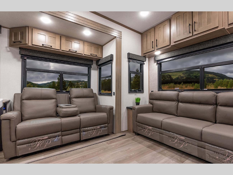 Sleeps 4 Slides 4 Length 36 ft 8 in Ext Width 8 ft 5 in Ext Height 13 ft 6 in Int Height 6 ft 8 in Interior Color Mink, Pebble Exterior Color Black Pearl Full Body Paint Option Hitch Weight 2730 lbs GVWR 14995 lbs Dry Weight 13270 lbs Cargo Capacity 1725 lbs Fresh Water Capacity 76 gals Grey Water Capacity 90 gals Black Water Capacity 50 gals Tire Size 17.5" Furnace BTU 40000 btu Available Beds King Refrigerator Type House Refrigerator with 2000W Inverter Refrigerator Size 26 cu ft Convection Cooking Yes Cooktop Burners 4 Shower Size 48" x 30" Number of Awnings 1 Axle Weight 10540 lbs LP Tank Capacity 30 lbs Water Heater Type On Demand Tankless AC BTU 45000 btu TV Info LR 50" Smart LED TV, BR 32" Smart LED TV Awning Info 17' Electric w/LED Light Strip Axle Count 2 Washer/Dryer Available Yes Number of LP Tanks 2 Shower Type Shower w/Seat Electrical Service 50 amp Similar Floorplans