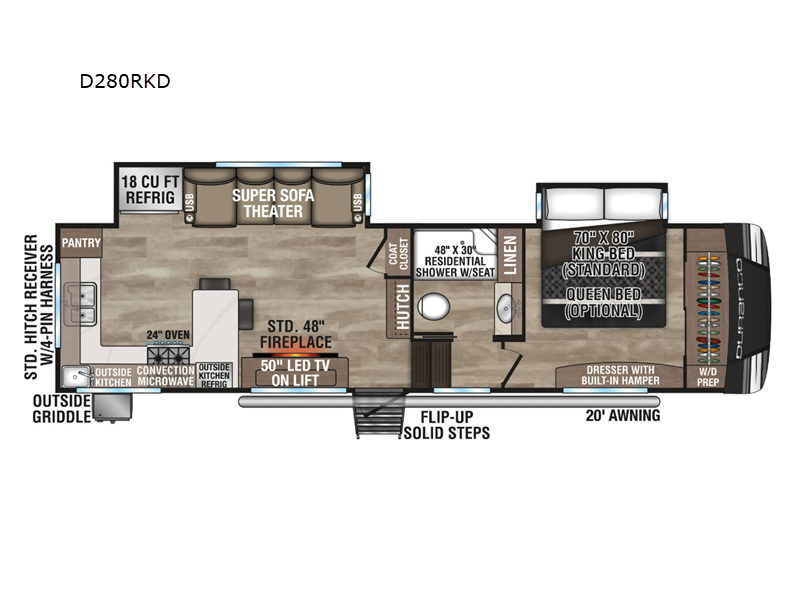 The chef will love cooking in the rear kitchen of this fifth wheel! They could even cook the catch of the day on the outside griddle while enjoying a cold beverage from the refrigerator. You can enjoy your meals in the two bar stools at the kitchen countertop then lay down on the super sofa theater with USB charging after stuffing yourself full. There is even a 48" fireplace and a 50" LED TV on lift to enjoy movie nights! Freshen up each morning in the full bathroom with the 48" x 30" residential shower with a seat and easily grab your towel from the linen closet next to it. When you're ready to wind down your nights, head to the front private bedroom to change into your pajamas stored in the dresser with a built-in hamper or from the front wardrobe that includes washer and dryer prep. There is also a king bed slide out or you can choose the optional queen bed if you want more floor space. The hitch receiver comes with a four pin harness adds more security!