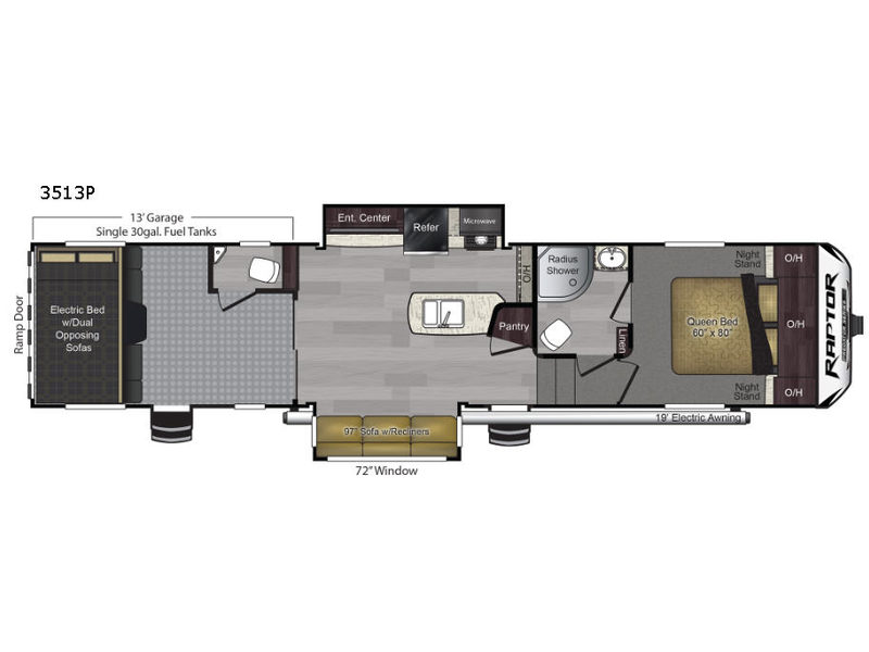 A separate 13' garage in this Predator Series Raptor model is a huge plus if you are concerned about keeping the garage area smells out of the kitchen! With a half bath in the garage area as well, the dirt and grime being brought inside will be minimal from your outdoor thrill seekers! And, with an electric bed and dual opposing sofas you can easily bring along a few riding buddies for the trip. Inside the main living area, you will find the comforts of home when you are done for the day. A warm meal, cool drinks, and a nice hot shower are all awaiting you. There is even a cozy private master bedroom with a queen bed up front for the owner of the rig to enjoy a little quiet time and a great night's rest! A 30-gallon fuel station for your toys, an outdoor shower, and a 19' electric awning with LED lights all add to the fun when you are not ready for the day to end. Let this Raptor Predator Series allow you all the fun you were hoping for on every weekend getaway!